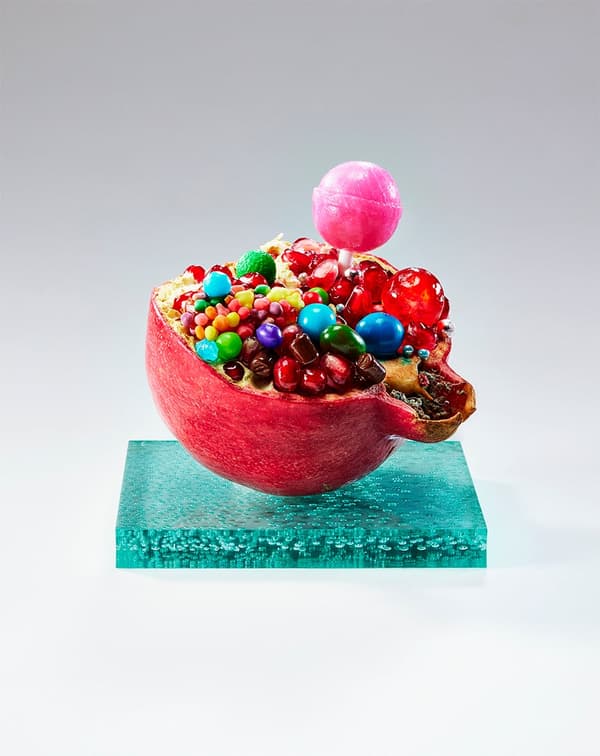 一件作品唤起了鲜明的甜味,因为宝石般的糖果从一个裂开的石榴中溢出。我们在这里面对的是天然甜味剂与人工甜味剂的现实——两者都好,两者都坏。健康和令人安心的天然甜味,以及承诺便利和快乐的人工甜味,都深深地嵌入我们的生活,无法完全避免。该系列总共由四件作品组成,将石榴和橙子等含有天然甜味的水果与象征人工甜味的糖果和巧克力并列,在对比的同时允许它们在同一空间中共存。除了那甜蜜的诱惑之外,选择的困难和当代人安静地生活在一起的感觉也浮出水面。