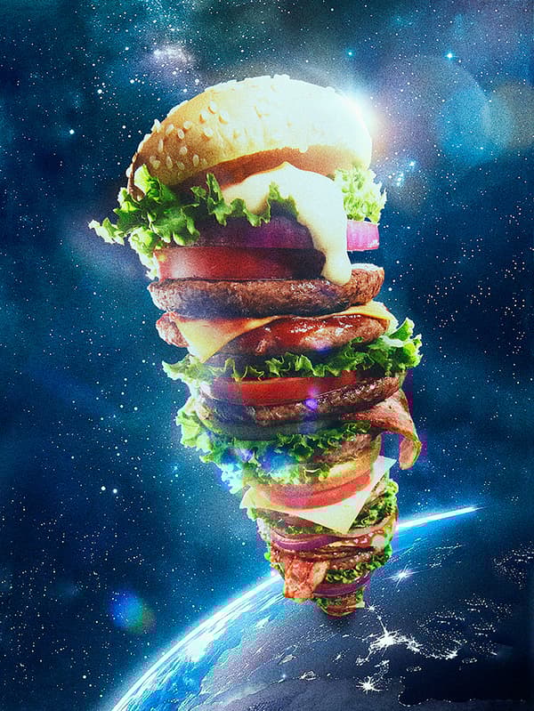 一件作品通过一个大到可以到达太空的汉堡,揭示了广告中“过度”的美学。颜色、形式、光泽和纹理都偏离了现实,过度的咝咝声表达变成了另一个维度的现实。这件作品总共由三部分组成:戏剧性地延伸的披萨奶酪,以及围绕叉子旋转的意大利面。虽然夸张放大了“美味”,但同时也唤起了一种不可思议的幽默感。“那是假的!太多了!!”的呼喊指向了广告所表达的快乐和不适之间的界限,质疑着我们自己的目光。