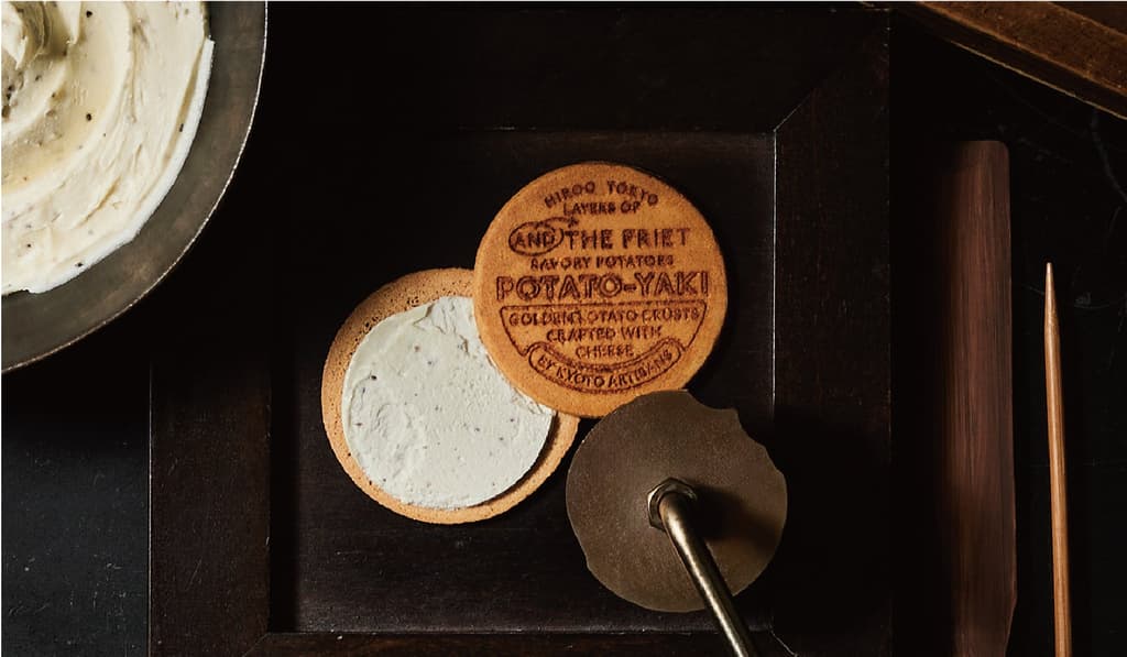 Goimo-Yaki是一种新概念土豆零食,或者更确切地说是一种“土豆甜点”,由土豆面团混合洋葱和胡椒制成。每一块都由工匠使用传承了100多年的京都传统煎饼(米饼)技术精心手工烘焙。酥脆、轻盈的威化饼充满了浓郁的卡门贝尔奶酪奶油,并注入了黑松露的香气。微妙的甜味、土豆风味和胡椒味的和谐融合,创造出一种前所未有的日式和西式口味的全新融合。