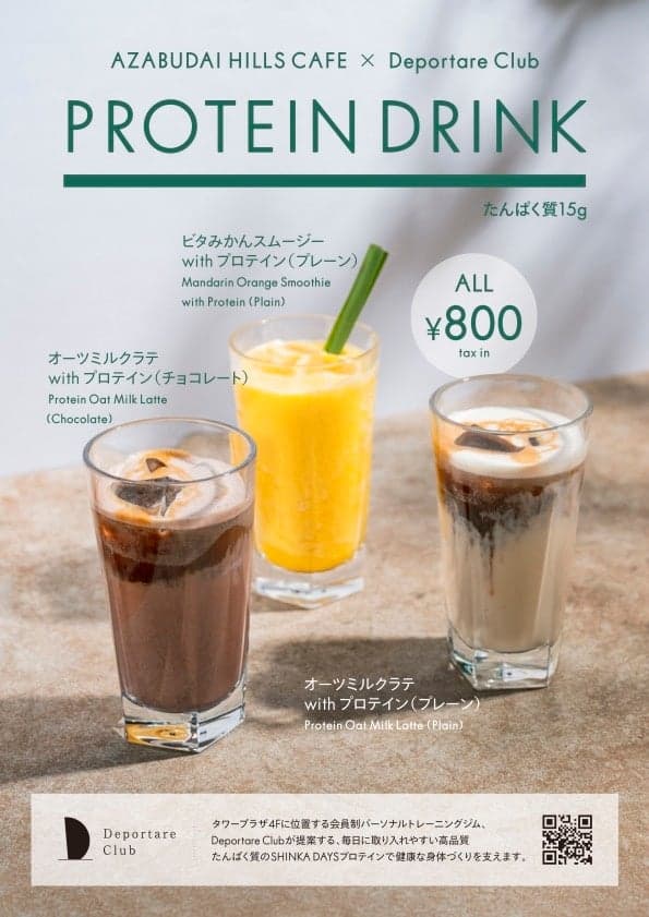从2026年2月2日星期一开始,麻布台之丘咖啡厅将提供三种与会员制私人健身房Deportare Club合作开发的蛋白质饮品。