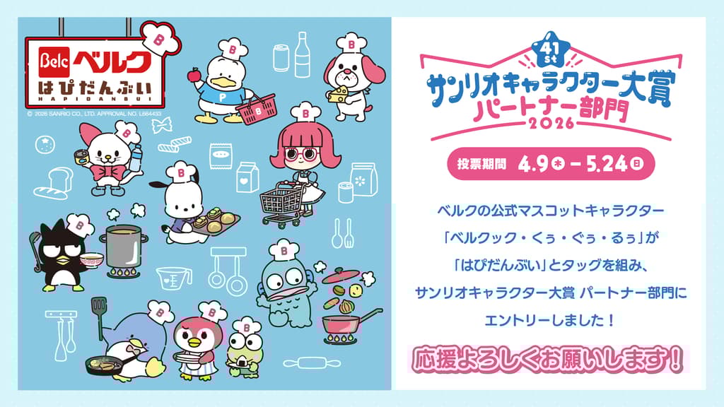 以关东地区为中心、拥有150余家门店的贝尔克超市(Belc),首次以"Belcook・Kuu・Guu・Ruu × 哈皮蛋卫"的名义参加2026年三丽鸥角色大赏合作部门。贝尔克的官方吉祥物"Belcook"及其伙伴们,将携手三丽鸥旗下人气角色组合"哈皮蛋卫"(ハピダンブイ)共同出战合作部门。