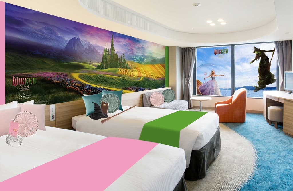以艾浮巴和葛琳达为灵感的特别联动客房以绿色和粉色为主色调。房间装饰有电影场景中的“黄砖路”挂毯,并包括艾浮巴的女巫帽和葛琳达的头饰。房间营造出一种特殊的氛围,让您只需入住即可沉浸在电影的世界中。