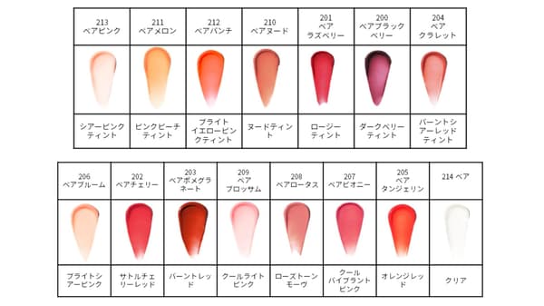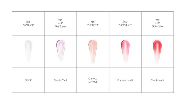 此外,它还采用了“绽放色彩技术”,该技术可响应唇部的pH值,从而提供适合每个人唇色的自然、柔和的色彩*2。5种透明色调的透明系列非常适合单独使用或叠涂在您喜欢的唇色上,以增加光泽和尺寸。