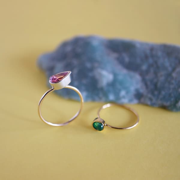 本次活动以"春日色彩"为主题,汇聚了绿色绿柱石、月光石、粉色碧玺等清新透亮的天然石。展示重点为"Protrude"、"Circle"、"Luna"等系列的天然石戒指,每件作品均采用品牌独创的宝石镶嵌工艺,设计旨在引入光线、充分展现每颗天然石的独特之美。
