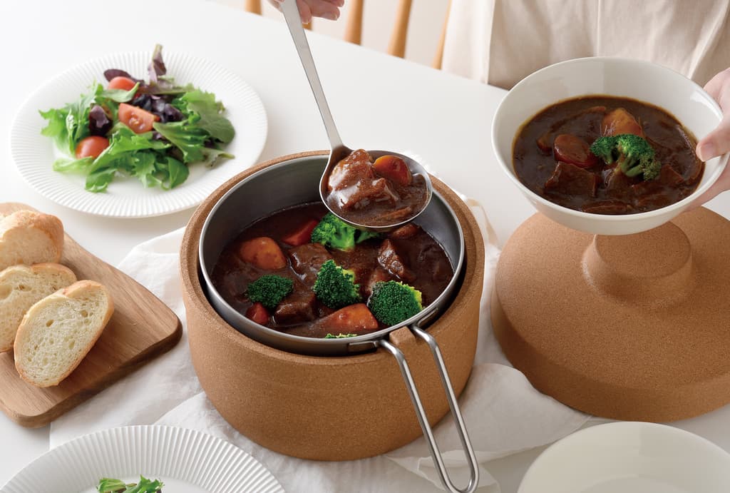 专用软木容器利用了软木材料的绝缘性能。当将加热后的锅放入其中时,它可以防止内部热量散失,并将温度保持在约 70°C 约 2 小时。与普通锅相比,温度下降得更慢,从而可以在烹饪后有效利用余热。随着温度缓慢降低,味道会彻底渗透到食材中。