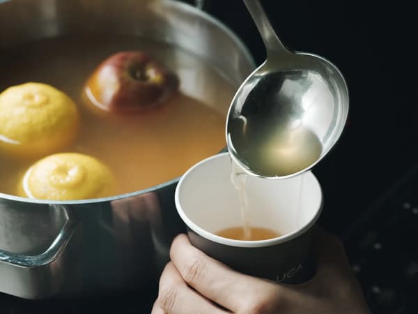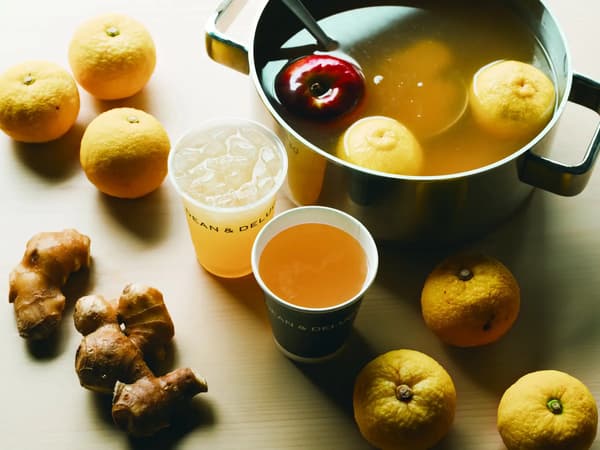 冬季完美的自製果汁回歸,由時令蘋果、柚子和生薑在店內的大鍋中燉煮而成。這種熱水果和生薑汁具有時令黃色柚子的清爽風味。由於它是每天用新鮮食材製成的,因此商店裡瀰漫著柚子舒緩的香氣。