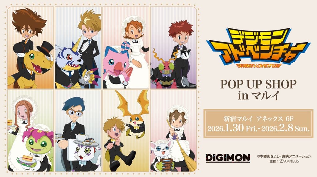 特别的数码宝贝大冒险快闪店将于2026年1月30日起在新宿丸井百货Annex馆开幕。本次活动将推出全新绘制的以女仆和管家为概念的商品,以及独家购买特典。