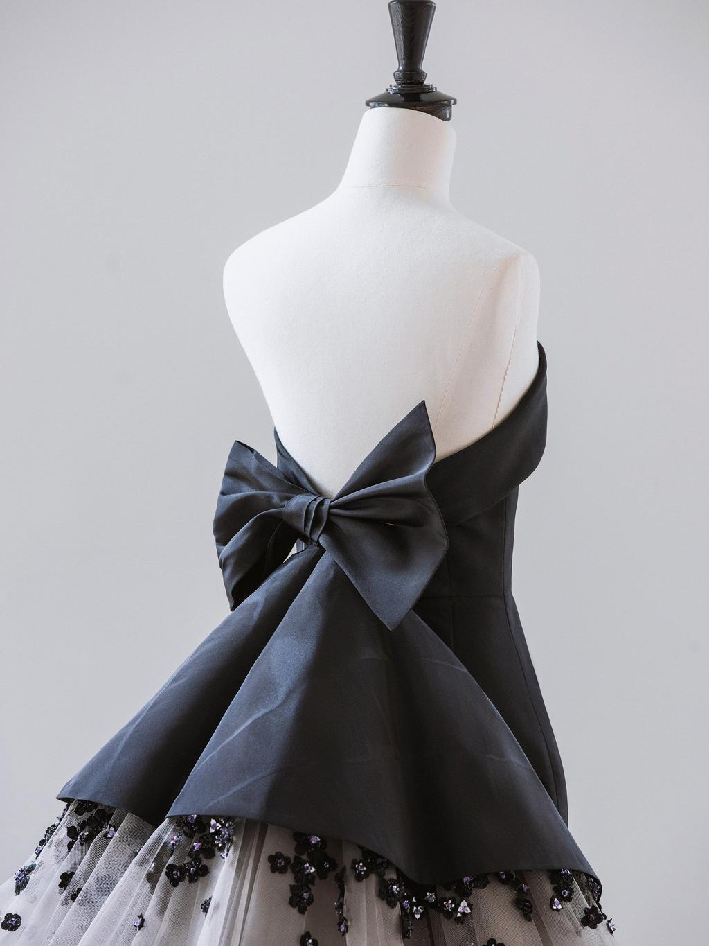 EJAE身穿一件黑色抹胸波纹绸礼服,饰有花卉刺绣薄纱。