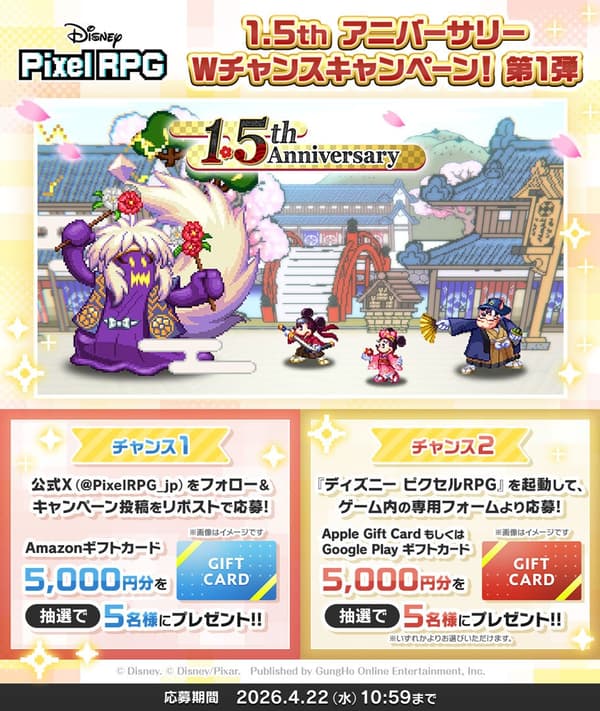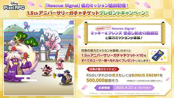 iOS和Android智能手机RPG《Disney Pixel RPG》于2026年4月7日迎来服务开启1.5周年纪念日。为庆祝这一时刻,游戏推出了多项限时活动与庆典。