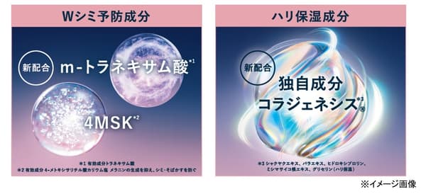 这些产品含有两种美白活性成分,可防止色斑:“m-传明酸1和4MSK2”,以及独家复合物“胶原焕活®*3”,以保持肌肤的坚定。它们引导肌肤呈现出充满通透感和紧致度的“水玉光”肌肤,滋润并美丽地反射光线。
