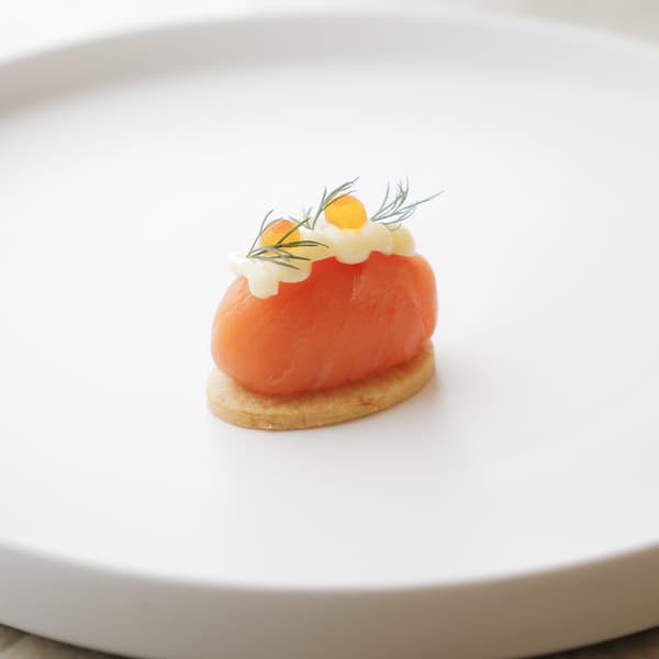柠檬奶油奶酪和烟熏三文鱼巧妙地分层在萨布列饼干上。顶部是鲑鱼籽鱼子酱和莳萝,它提供了深厚的风味,烟熏的浓郁和优雅的香气在您的味蕾上蔓延。