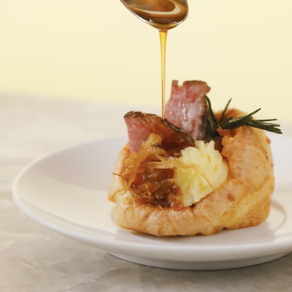 原田主厨的首选是这款约克郡布丁,它反映了EMBA KYOTO Grill的精髓:外酥内软,里面填充着烤和牛、烟熏土豆泥和焦糖洋葱。