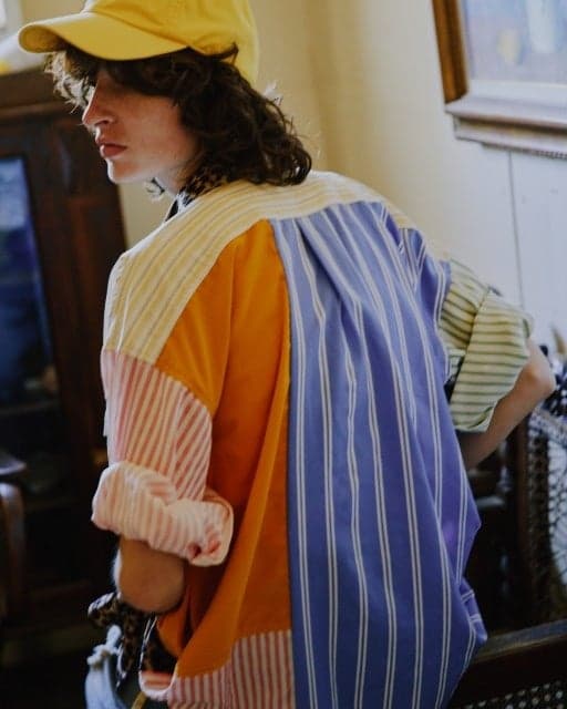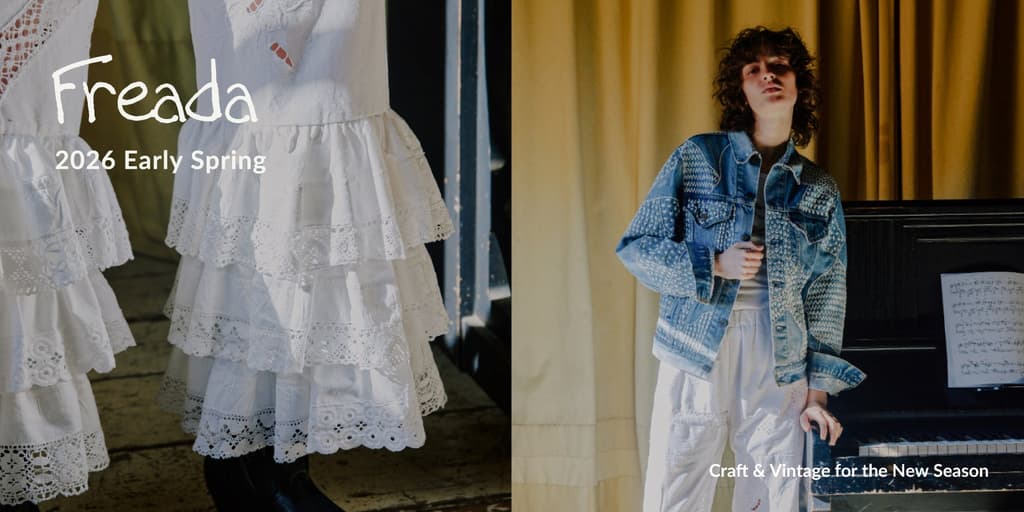 该系列包含独特的独一无二的单品,包括用法式桌布制成的裤子、由棉质手提袋改造而成的裤子和裙子,以及通过解构复古牛仔夹克制成的里外翻转牛仔夹克。全新的春季系列充满了 Freada 标志性的工艺和复古魅力。