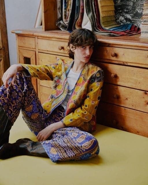 一件使用印度传统刺绣面料“Kantha”的夹克和裤子。这种面料是通过将旧纱丽分层并在整个过程中应用 sashiko 缝线制成的,每件作品都有独特的图案和厚度。夹克在接缝余量上采用滚边处理,并且可以双面穿着。这个系列让您可以穿着在孟加拉地区传承的手工艺魅力。