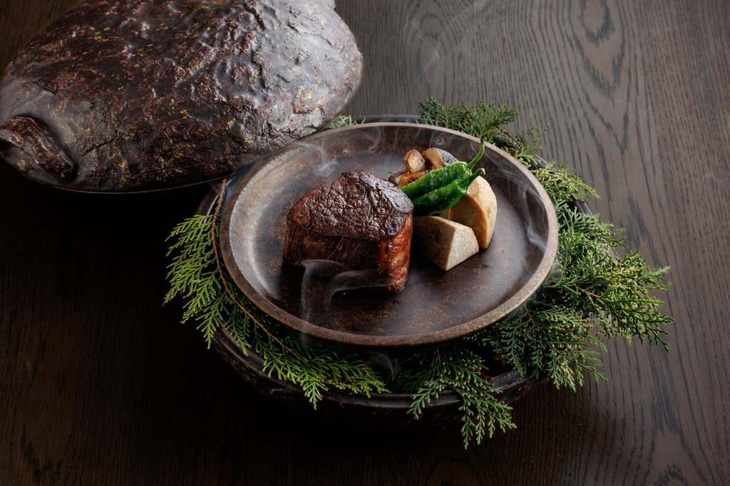在餐厅的柴火台烤制的和牛,风味浓郁,紧紧锁住美味,并带有淡淡的柴火香气。这道主菜充分展现了食材本身的魅力,搭配在轻井泽原始环境中用天然原木培育的香菇。