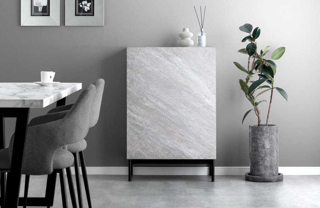 “展示型垃圾桶”作为一款具有柜子外观的垃圾桶而诞生,采用简约的设计,没有把手或装饰,并结合了别致的石材外观。它可以无缝地融入客厅,没有任何不协调感,营造出现代空间。