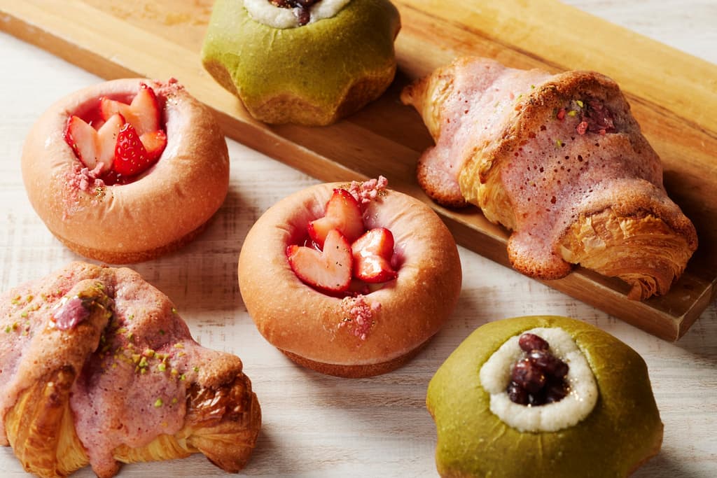 左右后方:樱花可颂,中央:樱花豆沙面包,右前方和中央后方:抹茶豆沙面包