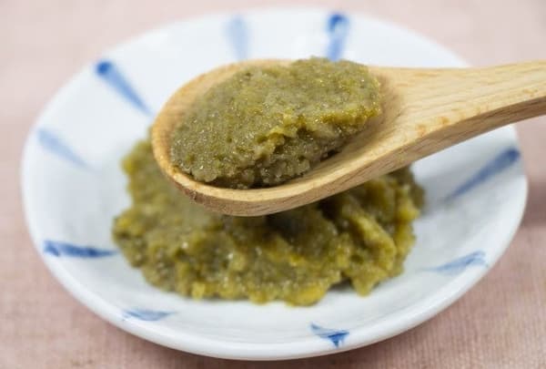 「木頭柚子 青柚子胡椒」在收穫後24小時內加工果皮,以最大限度地提高香味,並將鹽保持在最低限度。僅由特別種植的木頭柚子(無農藥和無化學肥料種植)、日本國產低農藥青辣椒和曬乾的鹽製成,青柚子的清爽香味為山むすび增添了亮點。