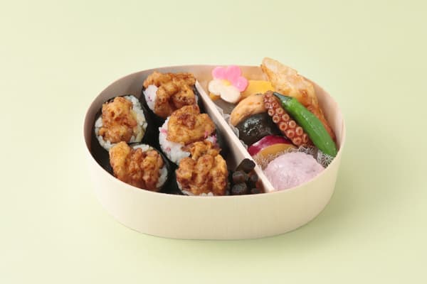 这款便当以 <银座若菜> 的“梅香泽庵”和“紫苏红姜”制作的饭团,以及用“江户牛蒡”制作的天妇罗饭团为特色,搭配春季色彩的配菜。[银座三越限定] <Jiraya> × <银座若菜> 合作天妇罗饭团便当 – 每日限定20个,1,404日元(1盒)■ Annex 地下2层,便当