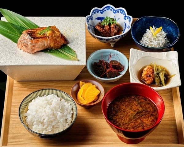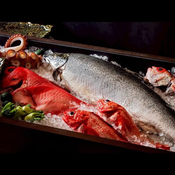时令鱼和优质肉类在柜台的展示柜中展示,让客人可以选择当天看起来最好的食材——然后根据食材的特点,将其制成生鱼片、炭烤或炖煮。午餐时,提供别邸套餐,价格为2,500日元,有两种以鲑鱼为中心的选项。