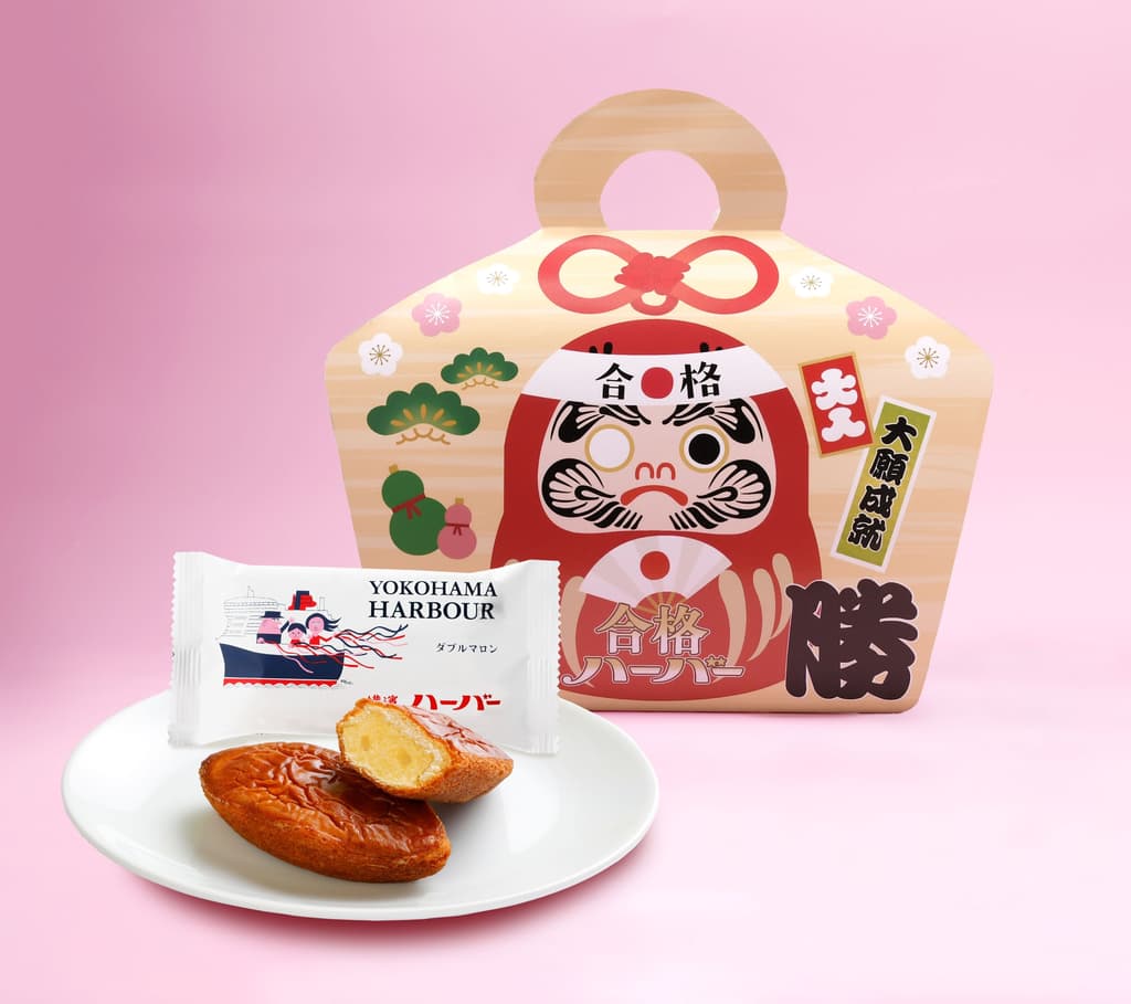 这款季节限定产品每年都广受好评。今年,包装内新增了“成功贴纸”。包装采用绘马(木制祈愿牌)和达摩图案设计,可以在上面书写留言。该设计体现了公司希望温柔守护和支持为目标努力学习的学生的愿望。内含五个“横滨港双重栗子”蛋糕,这是一款使用传统方法烘焙的豪华栗子蛋糕,其灵感来自横滨港的船只。