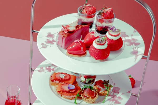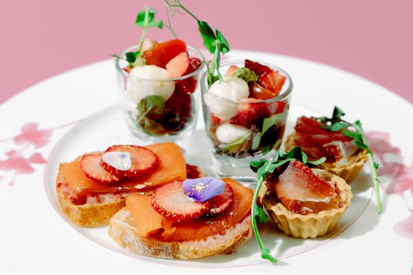 草莓也被奢华地融入到咸味菜肴中。在卡普雷塞和意式烤面包中,酸甜的水果与奶酪和鲑鱼的咸味形成了精致的和谐。烤饼的选择包括原味以及充满春天气息的草莓奶酪。从上到下,茶点架上都充满了草莓的吸引力。
