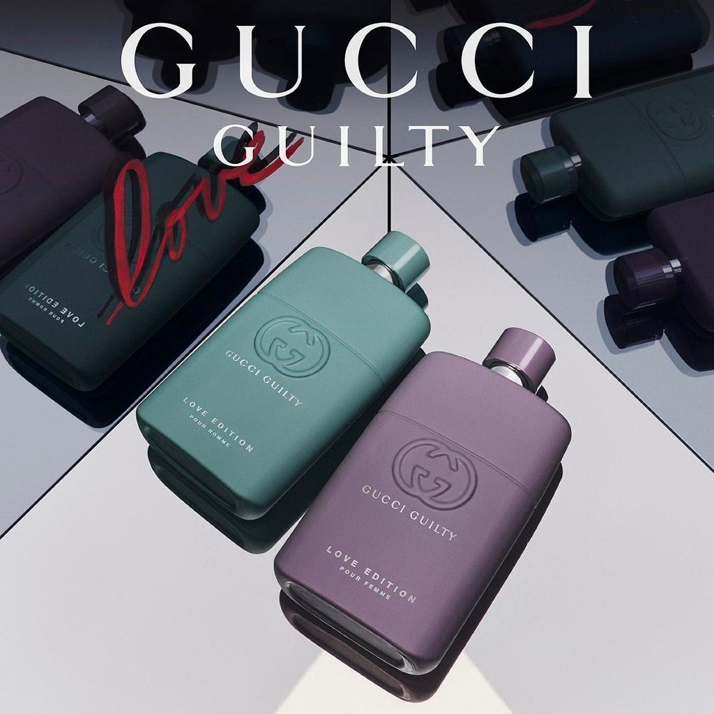 Gucci Guilty Love Edition 在一系列引人入胜的视觉效果中得到展示。这些广告视觉效果以新香氛为主要焦点,构图展示了两个瓶子并排或与 Gucci Guilty 系列的其他香氛组合在一起,象征性地表达了爱情的多面魅力。