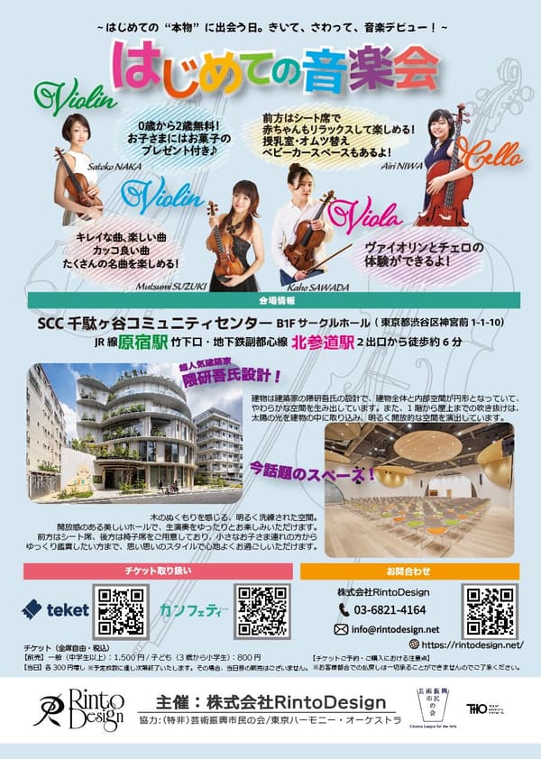 "Hajimete no Ongakukai"(初次音乐会)的黄金周特别场次将于2026年5月5日(周二·法定节假日)在东京都涩谷区神宫前1-1-10 SCC千驮谷社区中心B1F社区大厅举行。本次古典音乐会由东京和声管弦乐团演出,专为家庭设计,从出生起的婴幼儿均可入场。门票可通过Confetti购买。