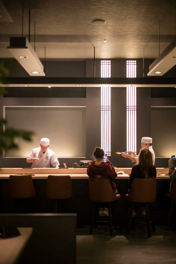 垂直的重点照明唤起了金泽标志性金箔的温暖光芒,为空间增添了宁静的优雅。在柜台后面,一件由天然木根制成的雕塑艺术品表达了金泽地区的活力。餐具包括九谷烧和轮岛漆器,为整个用餐体验增添了当地的美学气息。