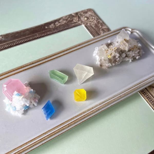 Harapecolab 每月限定「矿物系甜点(Koubutsu o Kashi)」4 月款以「钻石」和「摩根石(Morganite)」为主题,采用手工切割的琥珀糖(kohakuto)呈现。这款糖果兼具琥珀糖特有的口感——外皮酥脆,内里柔软绵密、入口即化。