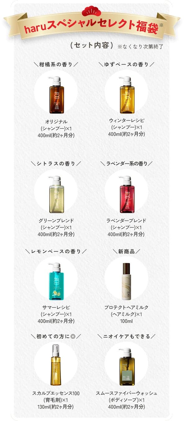 在年末和新年期间,将提供三种类型的福袋(※1),其中包含haru的热门商品。该活动包括福袋购买优惠券的发放以及一项抽奖活动(※2),10名获奖者可以获得“kurokami Scalp(haru洗发水)”,从而提供愉快的年末和新年购物体验。