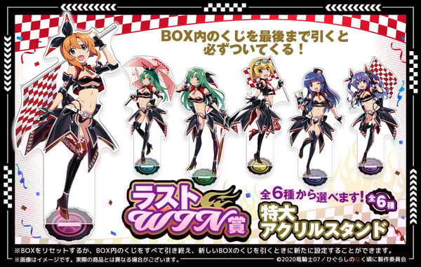 商品阵容包括以大幅面展示新插图的超大挂毯、包含所有角色的大尺寸亚克力视觉面板、非常适合拍照的亚克力卡片以及其他高级商品。Last WIN 奖品包含一个尺寸约为 30 厘米的超大亚克力立牌。