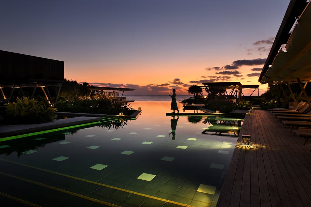 从下午6:00到7:30,客人可以品尝香槟鸡尾酒,欣赏太阳沉入大海,将水面染成深红色和琥珀色。鸡尾酒将冷冻热带水果与用冲绳食材制成的香槟饼干搭配。无边泳池倒映着天空不断变化的色彩,使其成为一个从各个角度都引人注目的视觉体验。