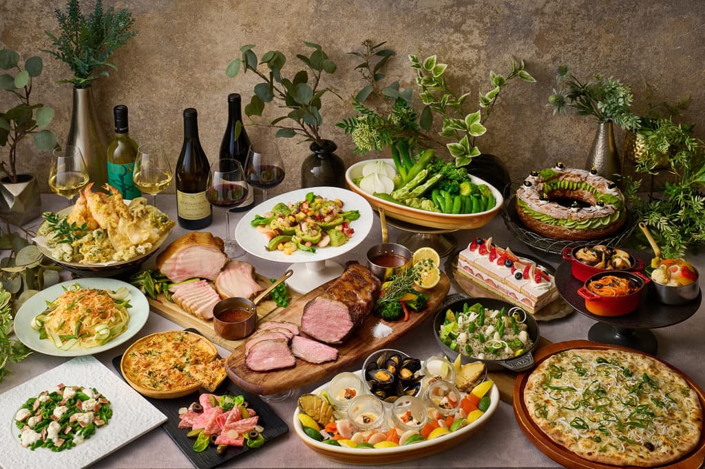 自助餐的特色是無限量供應的菜餚,採用時令春季食材,如吻仔魚、櫻花蝦、新土豆和春季捲心菜,並結合了京都的主食,包括九條蔥、水尾柚子和西京味噌。熱門的餐點包括烤牛肉和壽司櫃檯,壽司師傅會在用餐者眼前準備握壽司。