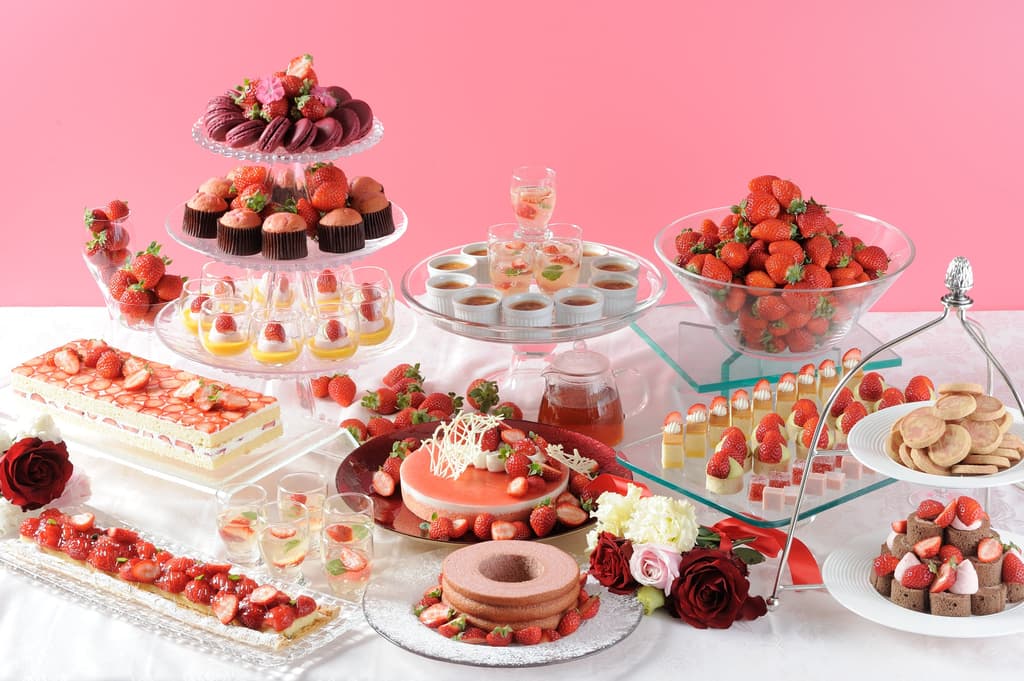 自助餐桌上摆放着15种草莓甜点。阵容包括“草莓开心果挞”等常年受欢迎的甜点,以及“草莓焦糖布丁”和“草莓气泡酒果冻”等创意产品。其中,不要错过糕点厨师推荐的“草莓奶油蛋糕”。体验蓬松柔软的海绵蛋糕、清淡的鲜奶油和新鲜草莓的和谐。