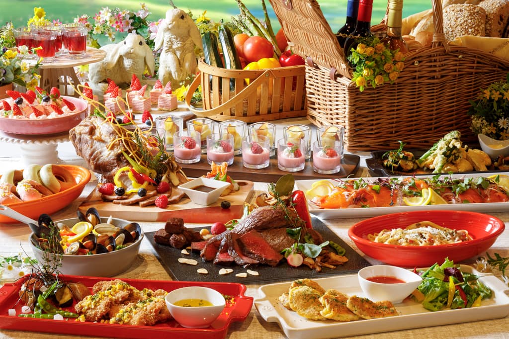 铁板烧国产牛肉 / 红酒汁烤猪五花肉 / 鲑鱼和油菜花炸丸子配蒜泥蛋黄酱 / 日式胡椒汁煎白鱼 / 牛肝菌奶油意面 / 马尼拉蛤蜊和海苔意面 / 鲑鱼和烤蔬菜番茄酱意面 / 牛肉烩饭 / 一口炸鸡排配榛果黄油酱 / 海鲜饭 / 色彩缤纷的蔬菜自助餐 / 意式炖蔬菜 / 西班牙腌鱼 / 暖红薯 / 草莓慕斯 / 草莓千层可丽饼 / 草莓卷蛋糕 / 完整草莓果冻等等