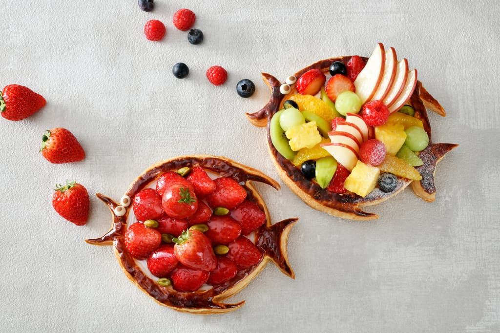 这款全新创意产品饰有包括苹果、猕猴桃、橙子、甜瓜和草莓在内的色彩缤纷的水果。装饰性的苹果切块营造出独特的鱼形设计。奶油的柔和甜味与泡芙糕点完美搭配,带来非凡的美味。