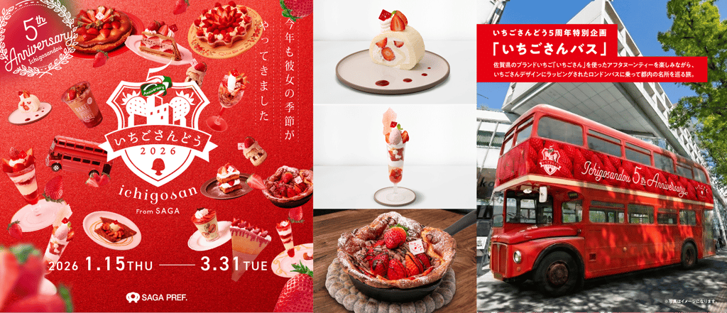 佐贺县正在举办“Ichigosando 2026”特别咖啡馆合作活动,在表参道12家热门咖啡馆和餐厅展示其高级草莓品牌“草莓小姐(Ichigosan)”。该活动从2026年1月15日持续到3月31日,届时每家参与店铺都将推出独家草莓菜单。