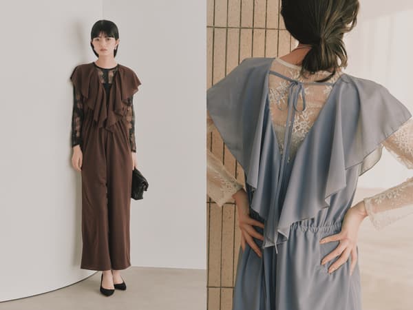 轻盈的裤装连衣裙,饰有大褶边,外观迷人。