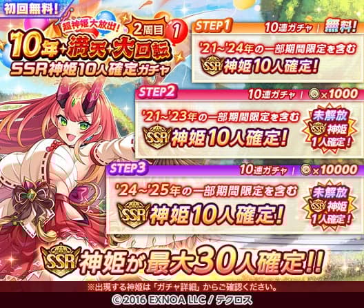 "首抽免费!10周年大转蛋"第二弹现已上线。第一套活动保证首次10连抽必出10名SSR神姬。第1步可免费抽取,第2步起需消耗神姬硬币。此外,连续10天每天都会推出全新的10周年大转蛋,所有转蛋均可首抽免费。