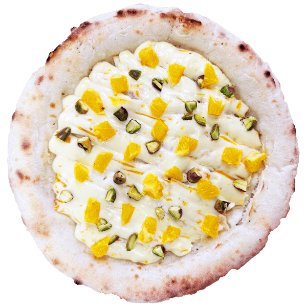 这款披萨顶部铺满了自制橙子奶油奶酪,并均匀撒上新鲜的橙子丁。它采用北海道奶油奶酪和意大利马斯卡彭奶酪制成,口感丰富而清爽,并添加了开心果碎作为点缀。这款甜点式披萨即使冷却后也很美味。