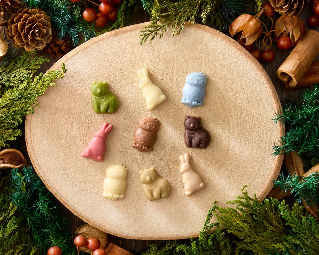可可魅力的特色是动物造型的迷你巧克力,其灵感来自轻井泽的四季和森林动物。每一块巧克力都是在工坊里精心制作的。