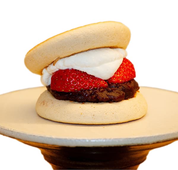 熊本引以为豪的品牌草莓“Yubeni”包裹在蓬松柔软的手工烘焙“馅三明治”煎饼中,该煎饼由甜酒和莲藕粉制成。 浓郁的鲜奶油和精心炖煮的微甜红豆沙,突出了稀有十胜红豆的风味,完美地融合在一起。
