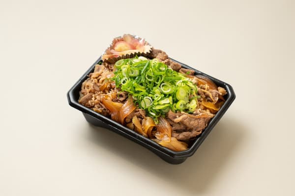 牛肉盖饭上铺有香甜可口的红牛肉和大量的九条葱。