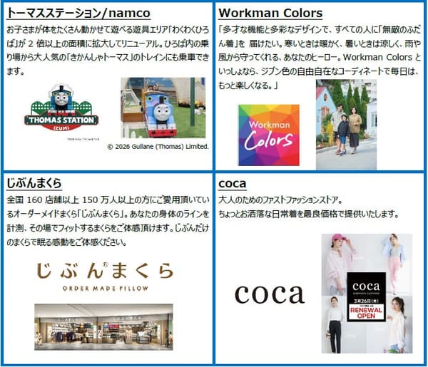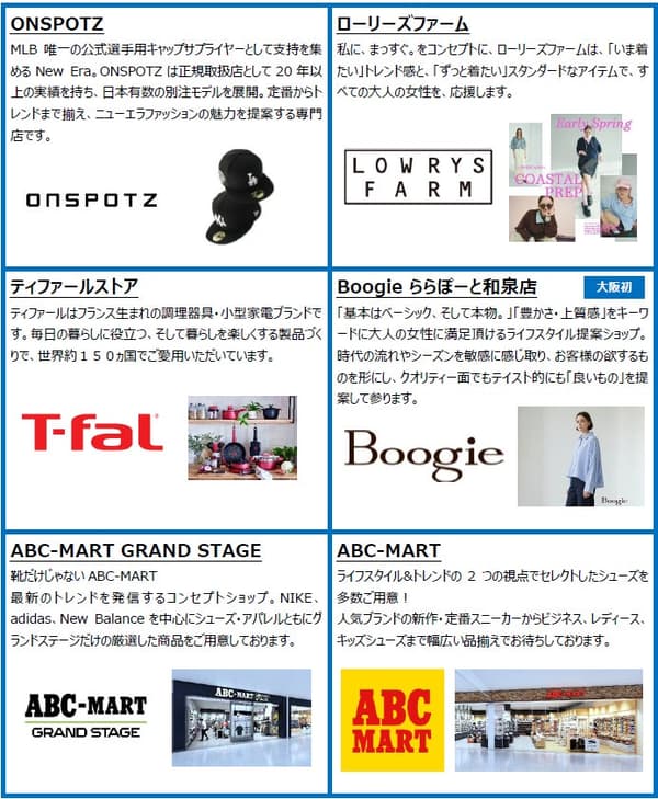 阵容包括值得关注的新租户,例如“Adidas Store by ABC-MART”(关西地区首家店,也是一种新的店铺概念)、“査洵小笼包”和“Boogie LaLaport Izumi”(均为首次亮相大阪),以及零售、餐饮和服务领域的其他19家新店。在翻新店铺中,“WORKMAN Plus”正在转变为新的“Workman Colors”概念,而“Mister Donut”和“托马斯小火车/namco”等熟悉的名字也焕然一新。