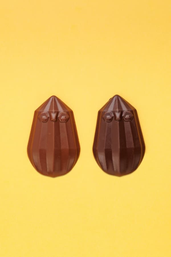 将可可豆荚和小鸡设计相结合的小巧克力,有两种口味:75% 黑巧克力和 45% 牛奶巧克力。