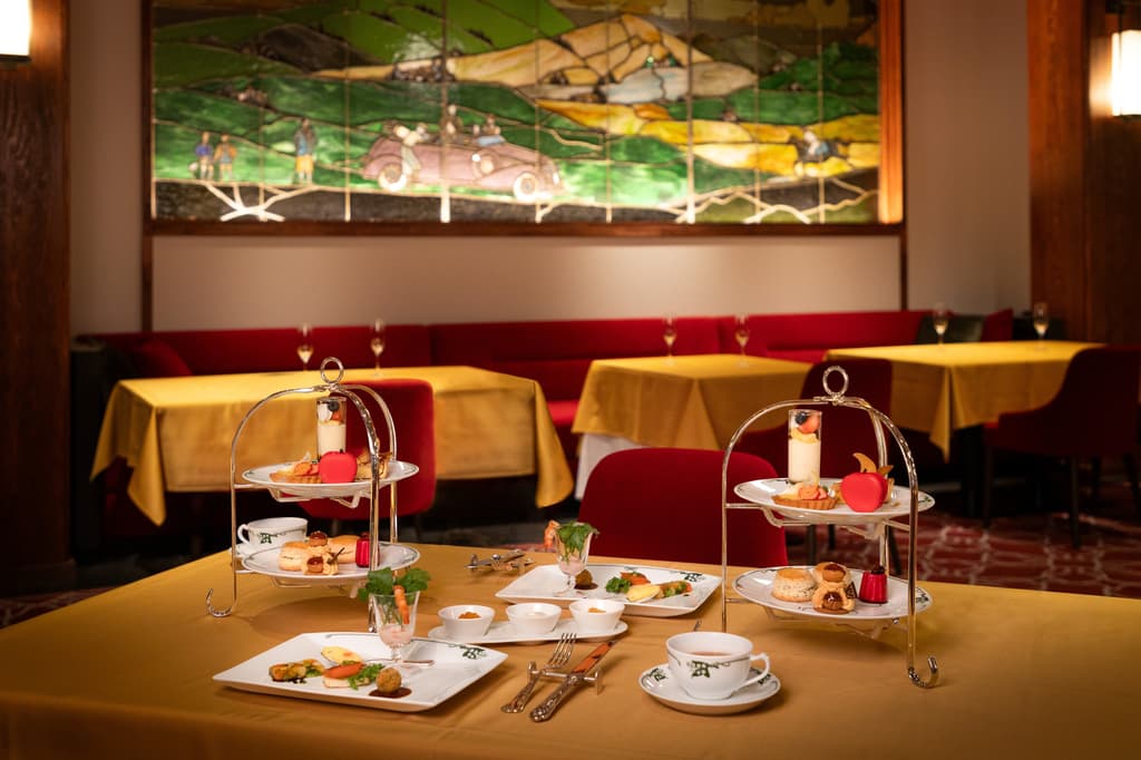 咸点包括信州鲑鱼开放式三明治,灵感来自酒店标志性彩色玻璃的蔬菜馅饼,以及用酒店传统多蜜酱制成的炸肉饼。这些菜肴融入了各种当地食材,让客人可以体验轻井泽的丰富物产。