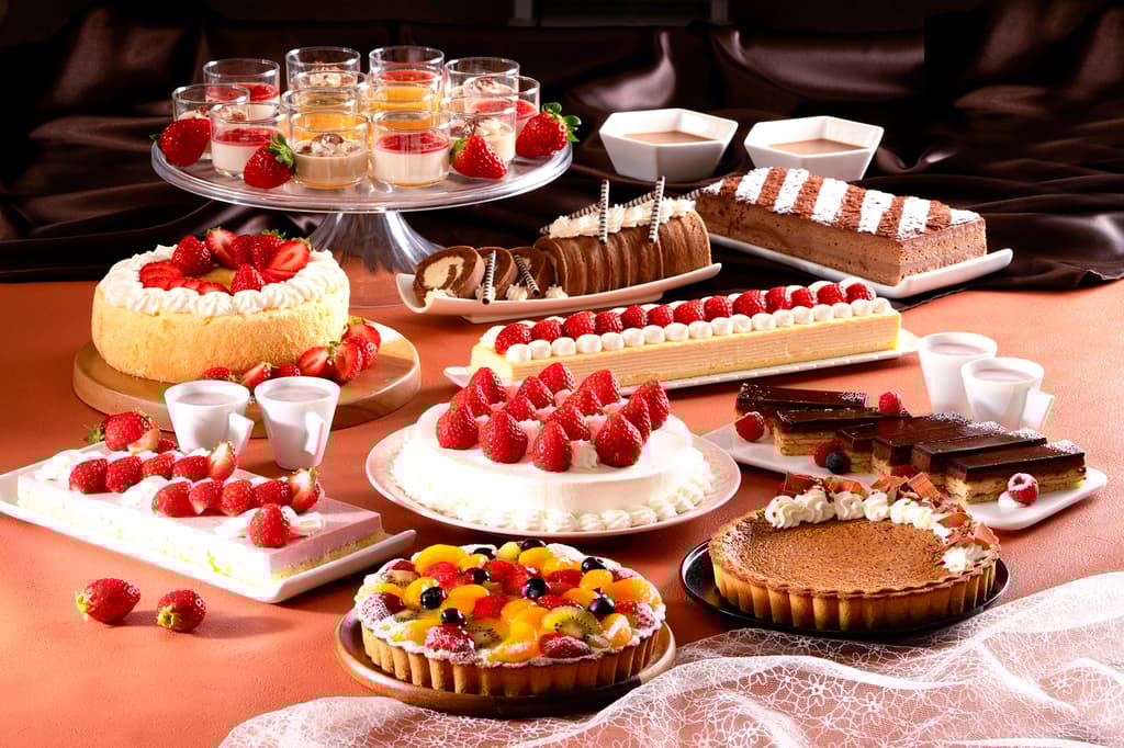 ○ 甜点:草莓或香草冰淇淋焦糖巧克力芭菲、草莓蛋糕、草莓牛奶冻、草莓戚风蛋糕、草莓千层可丽饼、草莓拿铁、草莓乳酪蛋糕、生巧克力卷、巧克力挞、巧克力蛋糕、布朗尼、歌剧蛋糕、巧克力咖啡布丁、水果挞、芝士蛋糕、咖啡果冻、甜甜圈展示