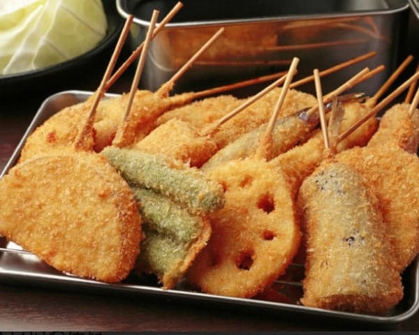 大阪风味的串炸,以海鲜、肉类和蔬菜为特色,炸至金黄酥脆。