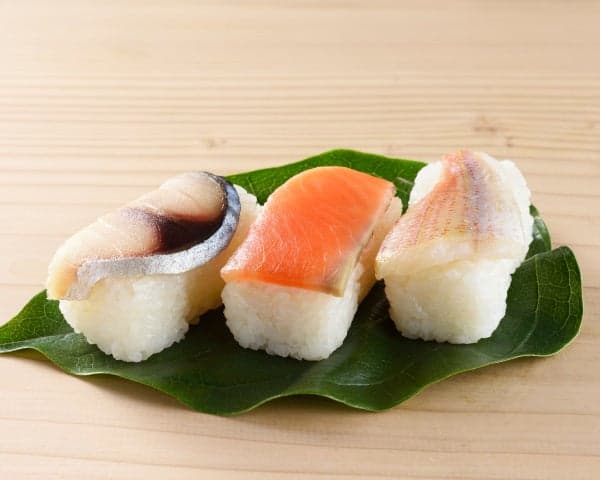 柿叶寿司什锦,以柿叶包裹的鲭鱼、鲑鱼和鲷鱼为特色,每种都有其独特的风味。